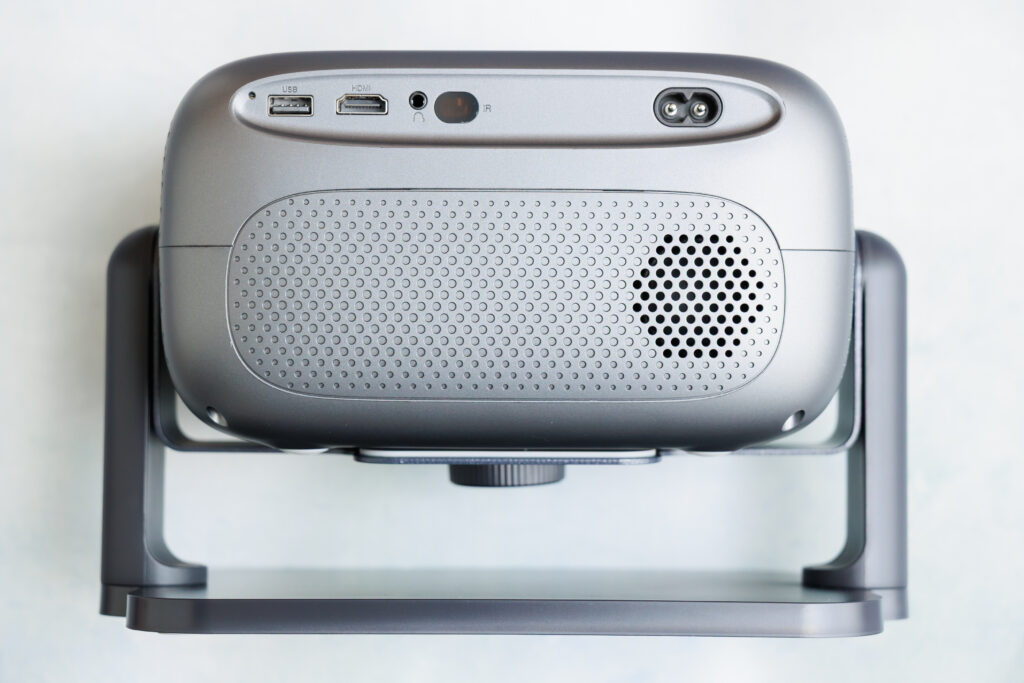 個人的に気に入っているのは、付属の台座による角度調整機能です。最大90度まで傾けられるので、正面投影はもちろん、天井に映し出すこともできます。実際に寝転がって天井に映画を映したときは、まるでプラネタリウムにいるような特別な気分を味わえました。