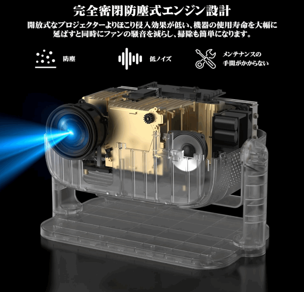 以前使っていた安価なプロジェクターで一番困ったのが、内部へのホコリの侵入でした。使用を重ねるうちに光学部品にホコリが付着して、投影品質が少しずつ劣化していくんです。